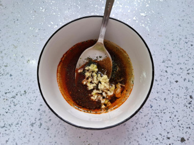 Мариновать я решила заранее, за сутки. Для маринада смешала подсолнечное и оливковое масло, немного приправы для курицы, чайную ложку с верхом паприки, сушеную пертушку, соевый соус и свежий чеснок. Мне нравится использовать именно свежий чеснок, он более ароматный и остренький. Но его вполне можно заменить порошком. Соевый соус у меня концентрированный, поэтому взяла его чуть меньше.