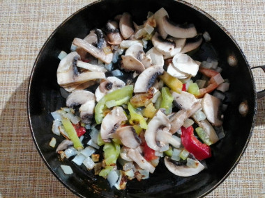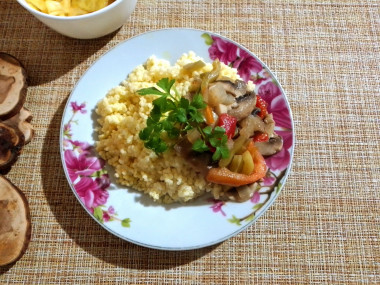 На втором круге, хватаем болгарский перец с луком, и делаем из них перемешанную кучку красиво нарезанных кубиков. 300 грамм грибов разделяем на ломти. Ссыпаем измельченные ингредиенты на сковороду, залитую растительным маслом, и жарим две минуты. Льем примерно четверть стакана воды в сковородку. Приступаем к тушению поджарившихся грибов и их компании. Тушение длится до пяти минут, по прошествии которых мы выкладываем пшенку на тарелку.