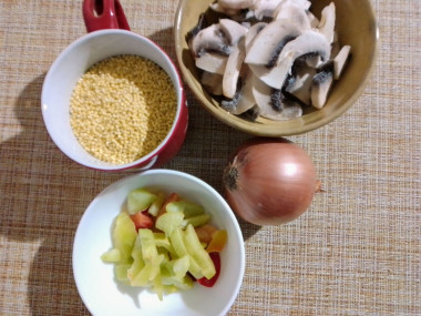 Перед приготовление пшено промыла и залила на пару минут кипятком, для того, чтобы каша не горчила. Пока варилось пшено я обжарила лук и добавила к нему замороженный болгарский перец и шампиньоны. Влила воды и потушила до готовности.