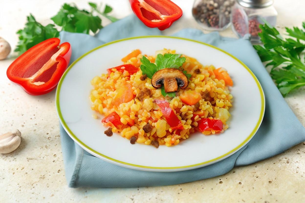 Жаренные лук, перец и грибы – полезное и вкусное дополнение. Насыпаем их поверх пшенки и приступаем к пробам!