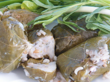 Вчера приготовила постную толму из виноградных листьев. Фарш у меня был из риса и полбы,заправила полной чайной ложкой черного перца(я люблю все острое),солью, свежей кинзой,добавила немного свежего тархуна,щепотку сушенного базилика и прожарку из репчатого лука с подсолнечным маслом. Вот сейчас сижу, ем ее в холодном виде и радуюсь жизни