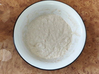 Замесите вязкое, неоднородное липкое тесто. Я замешивала силиконовой лопаткой. Тесто к ней почти не пристает. Но можно и руками, правда это не очень удобно.