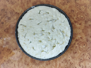 В классическом варианте фокаччи перед запеканием нужно просто посыпать ее крупной морской солью и полить оливковым маслом. По желанию можете воткнуть в тесто иголочки розмарина.