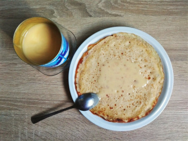 Жарьте блины с обеих сторон, пока они не станут золотистыми. Огонь отрегулируйте так, чтобы блины поджаривались достаточно быстро, но при этом не горели. Складывайте жареные блины стопкой. Пожарьте таким образом все тесто. Каждый блинчик смажьте равномерно сгущенкой с одной стороны.