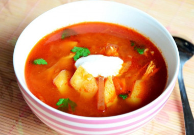 Подавать борщ на курином бульоне со сметаной или майонезом. Приятного аппетита!