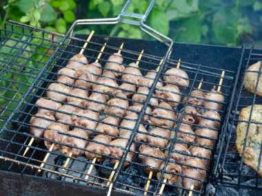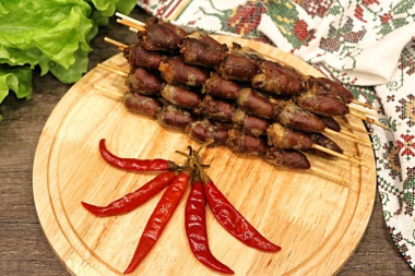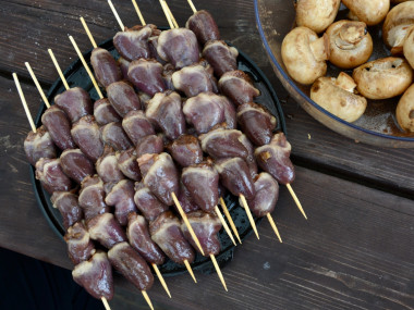 Деревянные шпажки достаточно короткие, и в традиционном виде их на мангал не поставить. Поэтому поставьте на мангал решетку для гриля и уже на нее положите шпажки с сердечками. Готовьте шашлык, достаточно часто переворачивая его, чтобы сердечки не пригорели, а равномерно прожарились. Общее время приготовления около 15-20 минут.