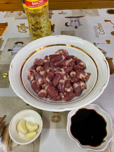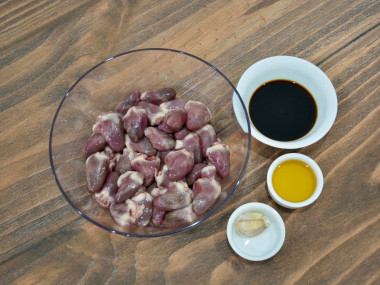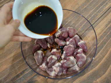 Уделите особое внимание выбору соевого соуса. Сейчас очень много дешевых аналогов натурального соевого соуса, но не гонитесь за ценой. Выбирайте соевый соус только натурального брожения, с минимальным составом без лишних добавок. И, поскольку мы будем использовать его для маринования сердечек, будет отлично, если вы возьмете соевый соус предназначенный специально для маринада. К сердечкам влейте соевый соус.
