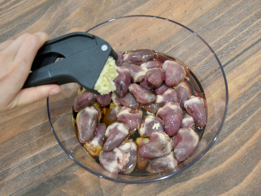 Добавьте измельченный чеснок. Я пропустила зубчик через пресс, но вы можете натереть чеснок на мелкой терке или измельчить его с помощью ножа. Допускается замена свежего чеснока чесночным порошком. Также на этом этапе вы можете добавить к сердечкам какие-то свои любимые травы или приправы: хмели-сунели, молотый перчик, прованские травы, тимьян или розмарин — выбирайте на свой вкус! Оставьте сердечки мариноваться минимум на 30 минут.