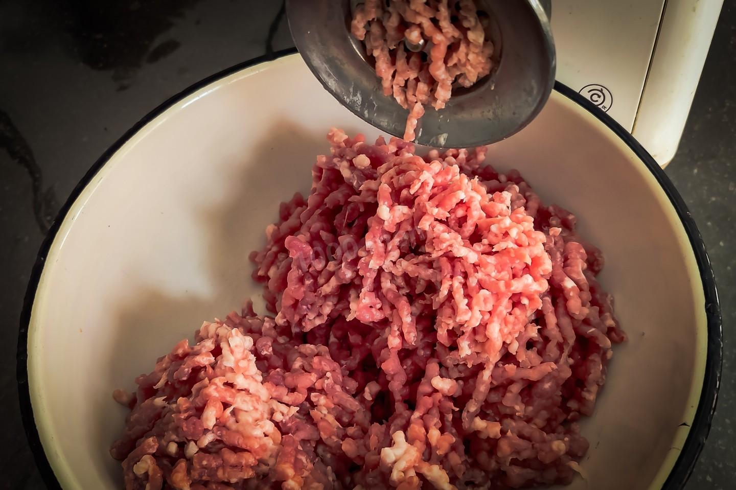 Пропустить кусочки мяса через мясорубку с самой маленькой сеточкой.