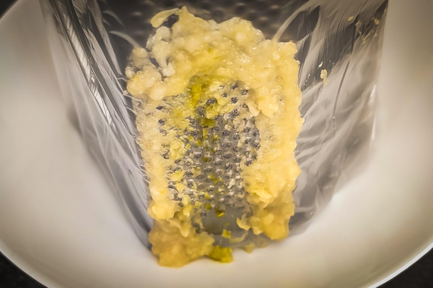 Чеснок натереть на самой маленькой тёрке. Для облегчения снятия натёртого чеснока советую на тёрку натянуть целлофановый пакет.