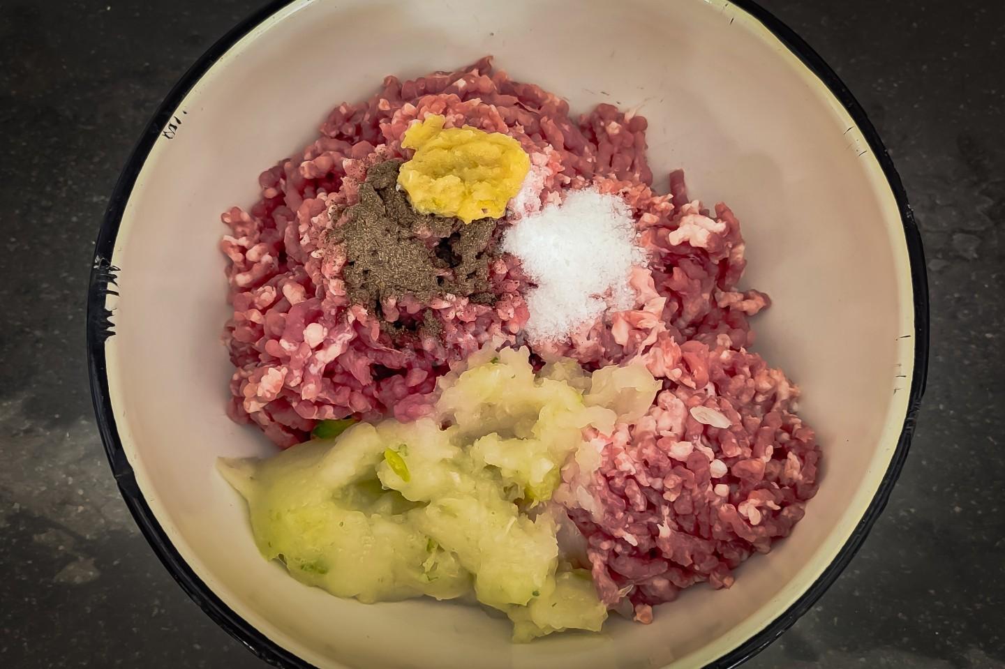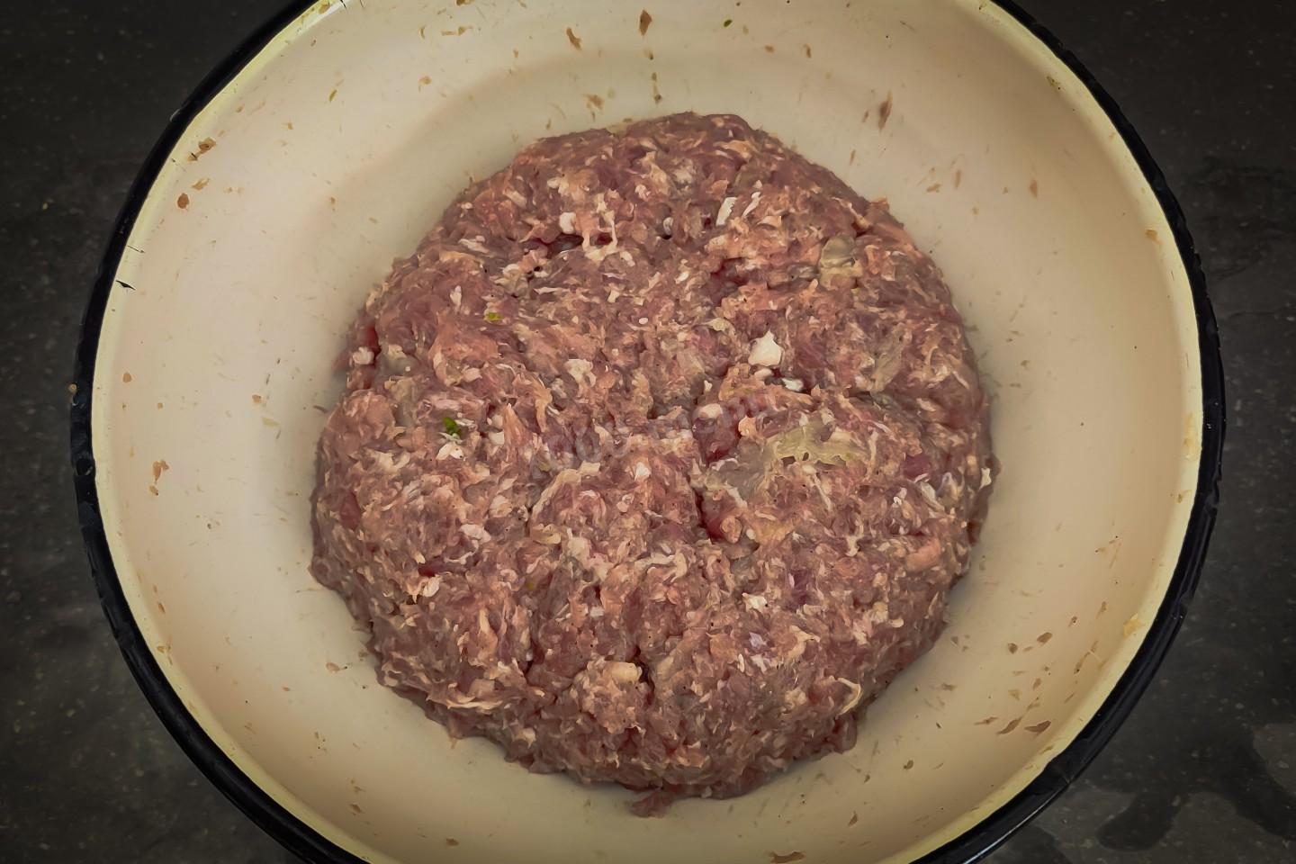 Когда всё ингредиенты хорошо перемешаются, отставить фарш в сторону.