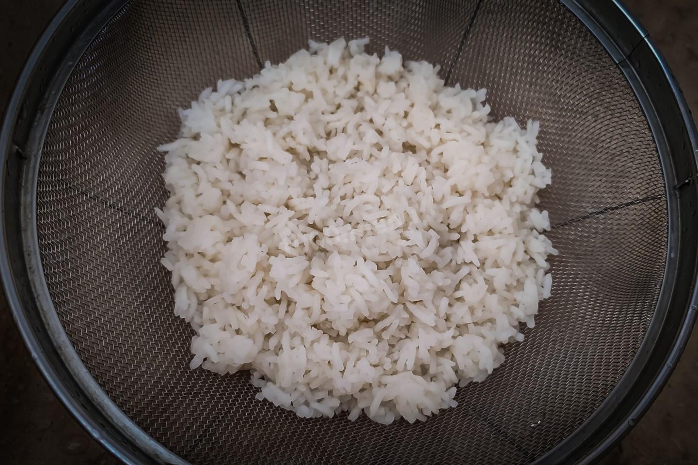 Отваренный рис слить через дуршлаг или ситечко, хорошо промыть холодной водой и дать всей жидкости хорошо стечь.