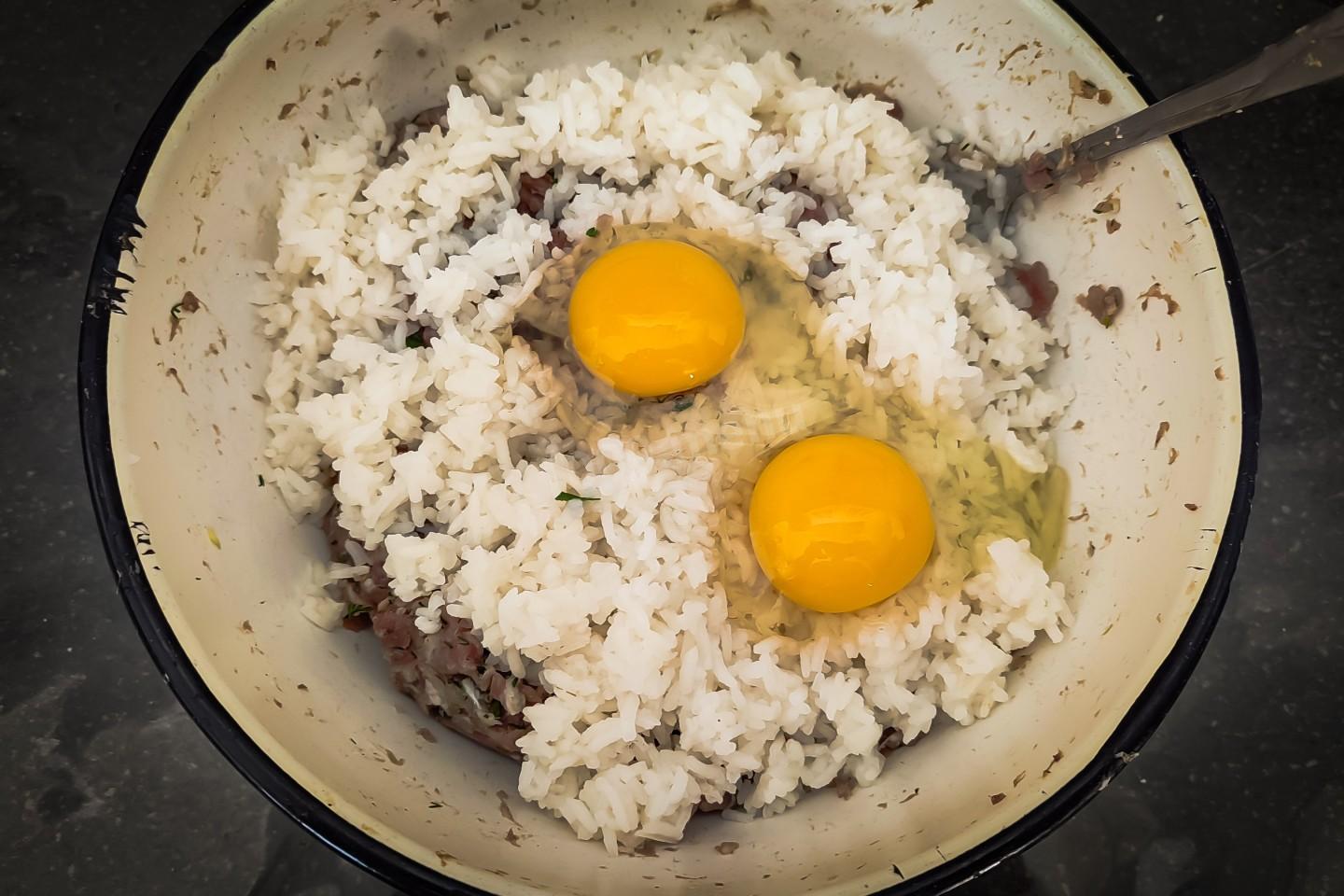 Когда жидкость стечёт с риса, переложить его в фарш, вбить 2 яйца и снова всё хорошо замесить. Должна получиться практически однородная масса.