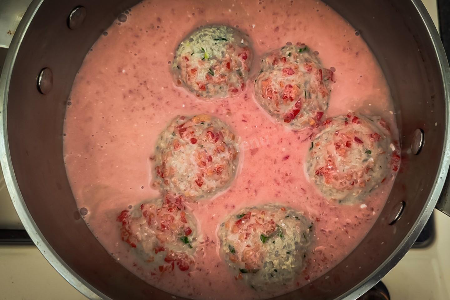 Через 20-30 секунд шокового заваривания тефтели вынуть её и уложить в пустую кастрюлю.