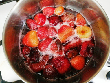 Поставьте выстоявшееся варенье на огонь. Вновь дождитесь его закипания, аккуратно размешивая лопаткой и снимая пену. Прокипятите варенье около 5 минут.