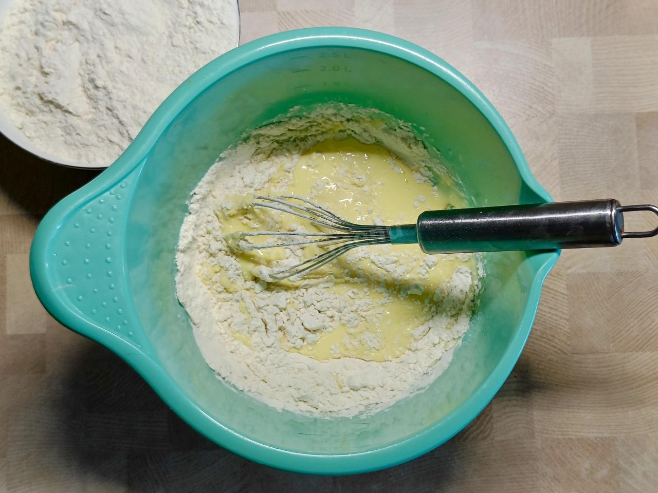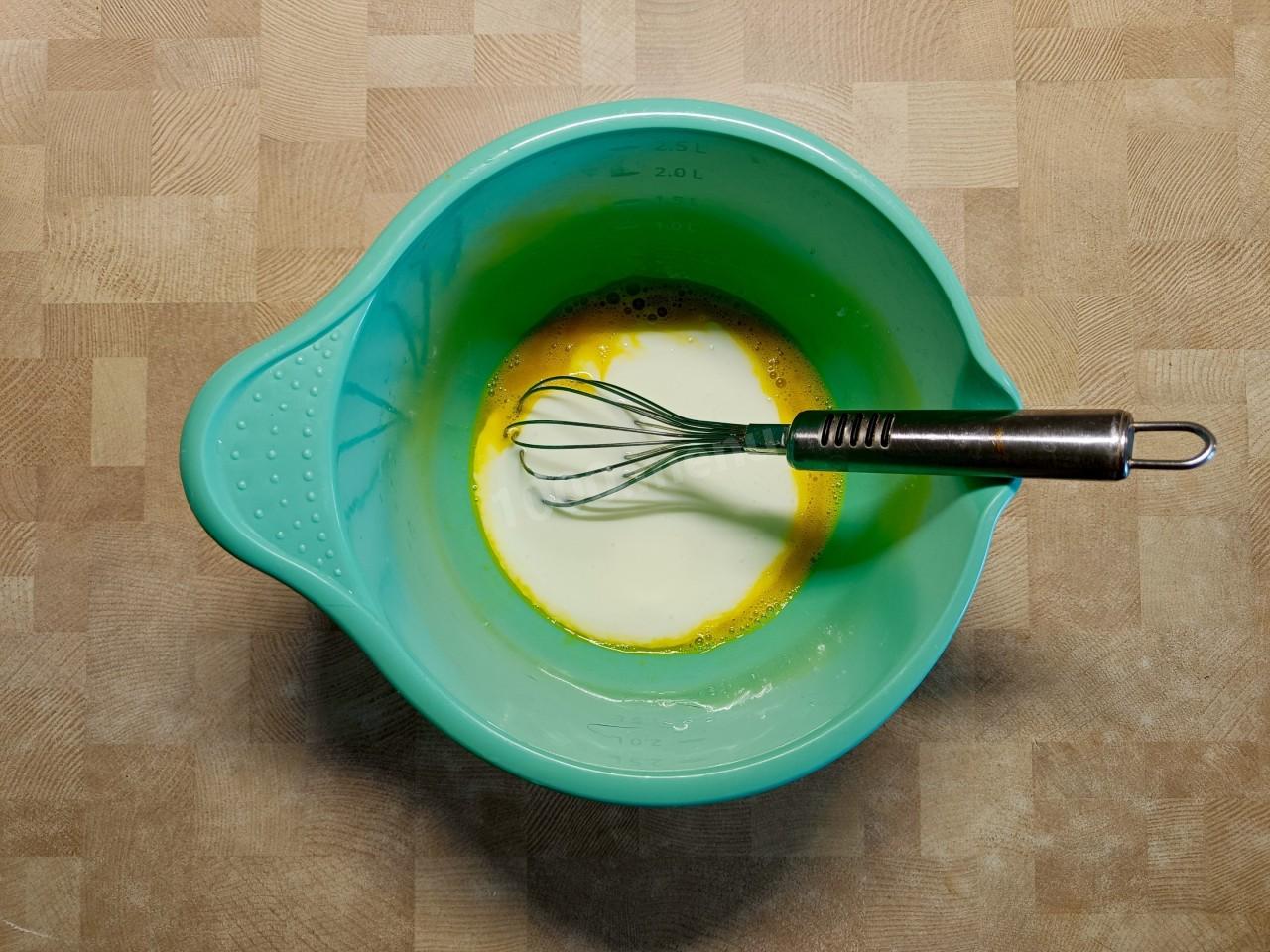 В миске соедините кефир, яйцо и соль. Обязательно используйте ингредиенты комнатной температуры, так как в таком случае продукты лучше смешиваются и тесто получается более однородным. Разболтайте массу венчиком до однородной консистенции.