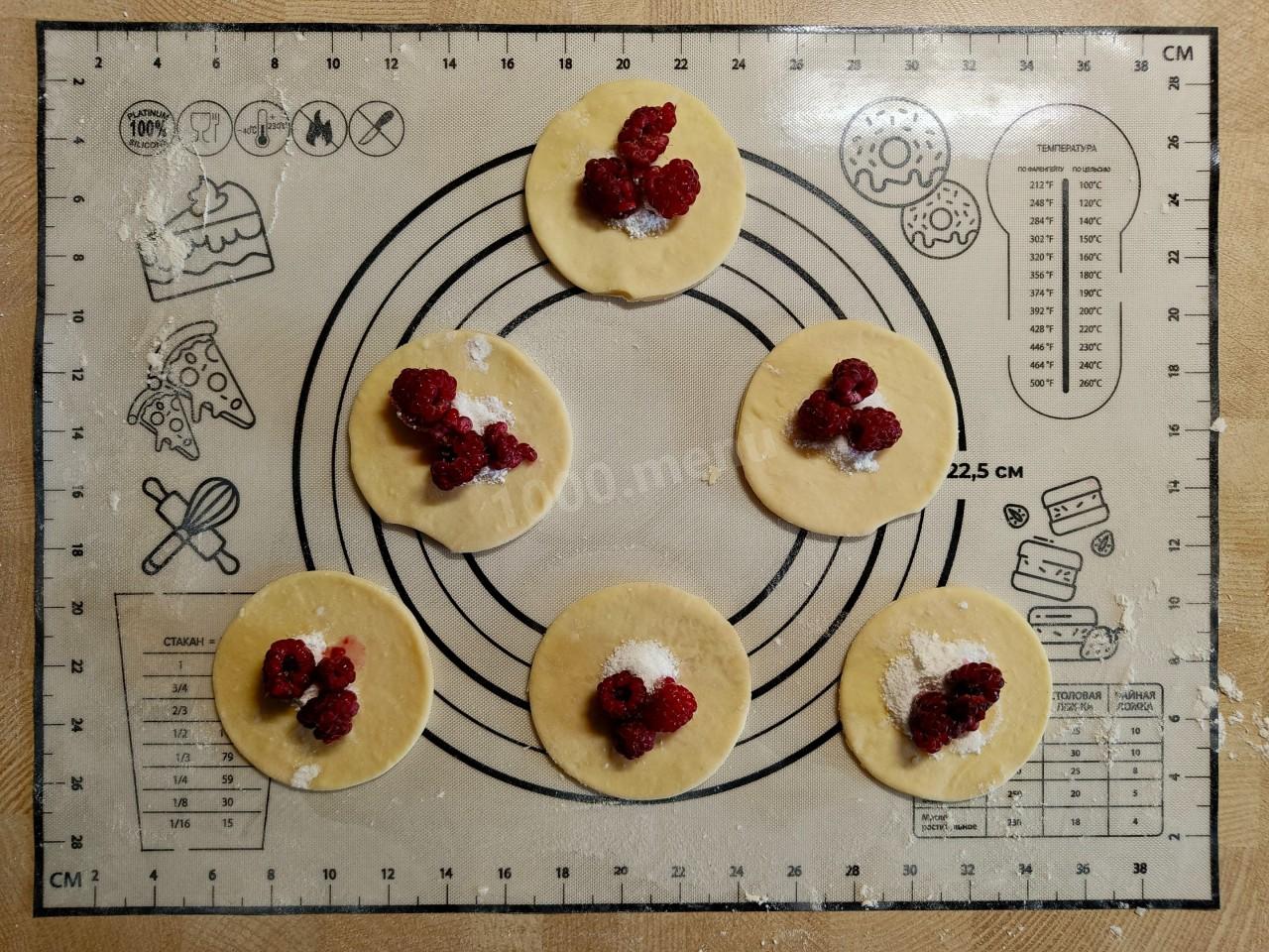 В центр каждого кружочка положите немного сахара с крахмалом. На сахарно-крахмальную посыпку выложите столько малины, чтобы было удобно скрепить края вареников. У меня поместилось по 3-4 ягоды.