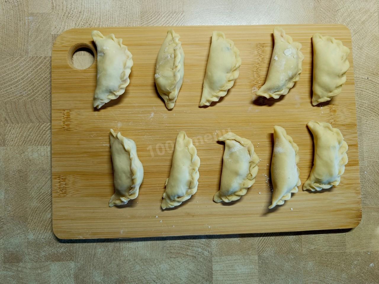 Сложите кружок пополам, защипните края. Соедините кончики «лодочкой» (для прочности). Слепите полумесяц, плотно прижимая края пальцами. Для лучшего склеивания по желанию можете смазать края кружка водой или яичным белком. Подробнее о том, как слепить красивые вареники читайте по ссылке в конце рецепта.
