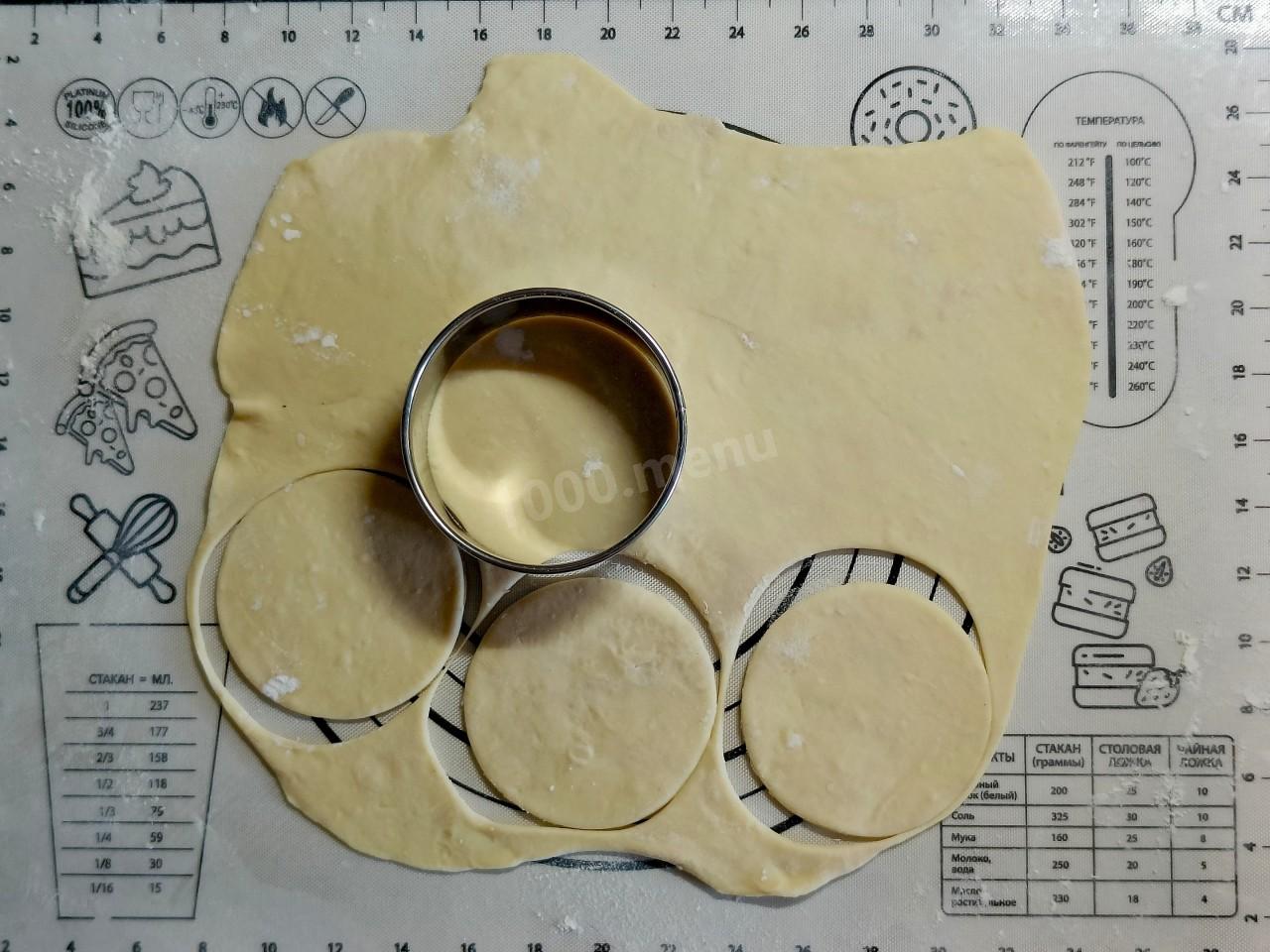 Тесто раскатайте в пласт толщиной 0,2-0,3 см, при необходимости подпылите рабочую поверхность мукой. Вырежьте из теста кружочки желаемого диаметра, воспользовавшись круглой формочкой для печенья или стаканом. Диаметр моих заготовок - около 8 см