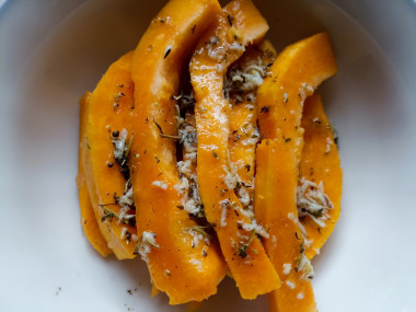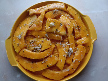 Выложите в миску ломтики тыквы и аккуратно перемешайте, чтобы она вся была покрыта ароматным маслом со специями. Оставьте мариноваться на 10 минут.
