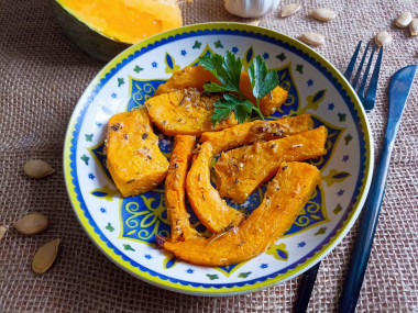 Тыкву, запеченную на противне, аккуратно переложите на тарелку, украсьте свежими веточками розмарина и подайте к столу. Приятного аппетита!