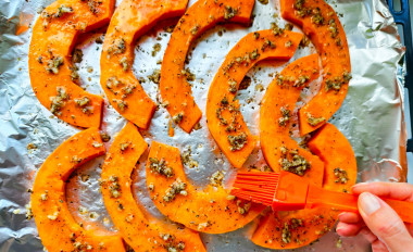 Разложите тыкву на застеленный фольгой противень и смажьте маринадом из миски. Поверх тыквы разложите веточки розмарина и лепестки чеснока. Фольгу для запекания лучше берите плотную. Если фольга тонкая и легко рвется, используйте 2-3 слоя. Об особенностях использования фольги читайте в статье по ссылке в конце рецепта.