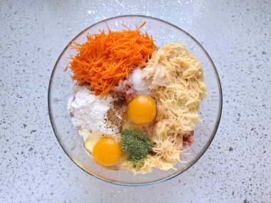 Фарш я сделала сама из постной свинины. Мясо измельчала в мясорубке, поэтому и лук тоже пропустила вместе с мясом. Морковь и картошку натерла на тёрке со средними зубцами. Картошку терла в последнюю очередь, чтобы не потемнела. Сразу вымесила фарш руками. Сформировала круглые колдуны и выложила в форму.