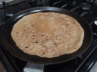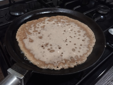 Сковороду смажьте растительным маслом и разогрейте на среднем огне. Налейте немного теста и распределите тонким слоем, наклоняя сковороду в стороны, чтобы тесто растеклось. Жарьте около минуты, чтобы низ подрумянился, а верх схватился. О том, как выбрать сковороду читайте в конце рецепта.