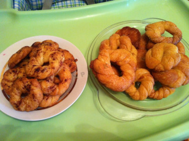 Поднимется тесто , разрезаем на отдельные кусочки, каждый в сантиметр толщиной. Поверхность кусочков посыпать корицей и сахаром. Закручиваем каждый кусок как-бы в толстую веревку. Складываем получившие колбаски так, чтобы оба конца одной колбаски прижимались друг к другу.