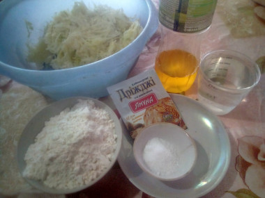 Решила попробовать приготовить "Постные кабачковые оладьи без яиц на воде". Кабачок натерла на терке, добавила все по списку.
