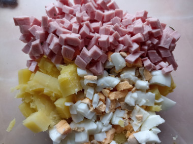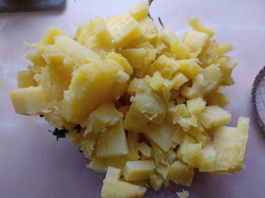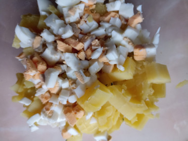 Как сварить яйца вкрутую? Чтобы яйца при варке не треснули, положите их в холодную воду и поставьте варить на небольшой огонь. Варите яйца 9 минут после закипания, затем залейте холодной водой и остудите. От резкого перепада температур скорлупа лучше очистится. Очистите их и нарежьте кубиками, затем добавьте в миску к картофелю.