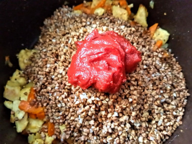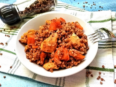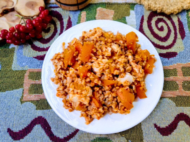 На обед сегодня приготовила гречку с курицей, овощами и тыквой. Обжарила все в указанной в рецепте последовательности. После добавила томатную пасту и гречку. Никаких приправ не добавляла, гречка пропиталась вкусом мяса и овощей. Проучилось вкусно и сытно.