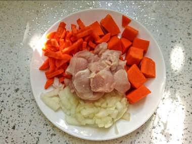 Пока готовится курица, очистите морковь, луковицу и тыкву.