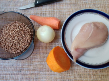 Как сделать гречку с курицей, овощами и тыквой? Подготовьте все необходимые ингредиенты. Промойте куриное филе. Подсушите его бумажным полотенцем. Нарежьте на небольшие кусочки. Можно также использовать куриную грудку. Тогда срежьте с кости мясо и нарежьте его кусочками. Из косточки приготовьте легкий и вкусный бульон.