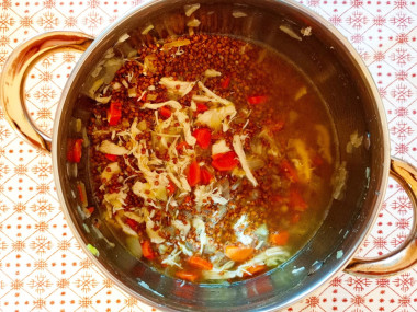 После этого добавьте промытую гречку. Промойте крупу дважды или трижды под проточной водой, пока вода не станет прозрачной, без примесей. С выбором гречки и нюансами её приготовления поможет статья по ссылке в конце рецепта.