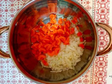 Нарежьте лук полукольцами. Тыкву нарежьте брусочками, а морковь кружками или полукружиями (если она крупная). Если хотите, добавьте в блюдо болгарский перец или помидор.