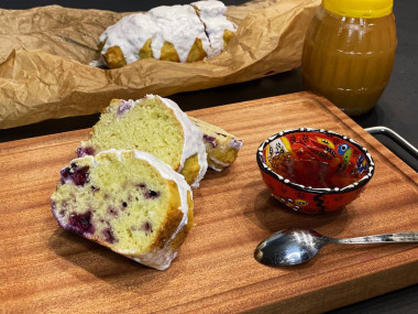 Полейте кекс сверху получившейся глазурью. Украсьте его лимонной цедрой, ягодами и мятой. Подавайте к столу. Приятного аппетита!