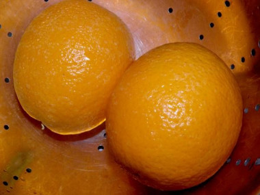 Положите апельсин в морозильную камеру на 2-3 часа, чтобы он замерз. Затем вытащите и дайте ему нагреться при комнатной температуре, чтобы его легко можно было нарезать. Для чего замораживать апельсин? После разморозки из него будет больше сока и уйдет горечь, которая бывает от кожуры.