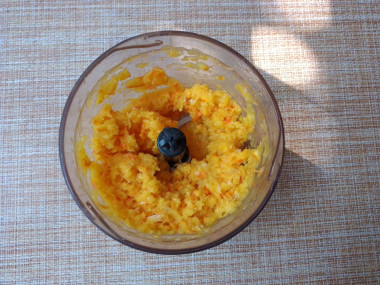 Измельчите апельсин до мелкого состояния. Мельчить до состояния пюре не надо.