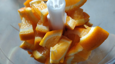 Размороженный апельсин нарежьте на кусочки, удалите косточки и выложите в чашу измельчителя.