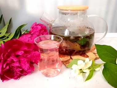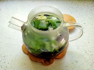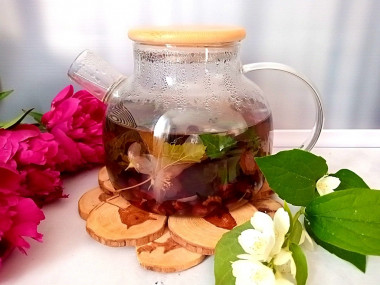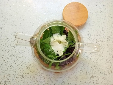 Заваривала чай в стеклянном чайнике, предварительно сполоснула его горячей водой. К собранным ингридиентам добавила две чайные ложки сахара. Чай настаивался 20 минут под пледом.