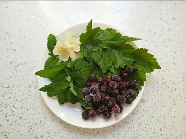 Выбрала хорошие, не поврежденные листочки. Также сорвала несколько веточек лимонной мяты. А проходя мимо куста жасмина прихватила несколько цветочков). Черная смородина у меня замороженная, правда гибридная, но тоже очень ароматная.