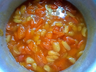 Добавьте абрикосы без косточек, перемешайте и оставьте при комнатной температуре на 20 часов. За это время абрикосы пустят сок.