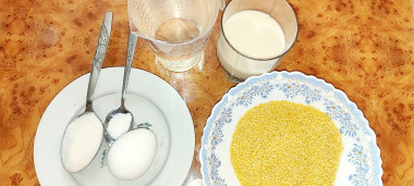 Как сварить пшенную кашу с яйцом? Подготовьте продукты. Количество воды дано примерное, я в процессе варки подливала еще. Будете смотреть по густоте каши и добавлять по необходимости. Молоко подойдет любой жирности. Сахар и соль регулируйте по своему вкусу.