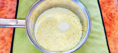 Влейте в кашу горячее молоко (его подогрейте на плите или в микроволновке). Всыпьте сахар и соль. Перемешайте и оставьте кашу вариться еще примерно на 5 минут.