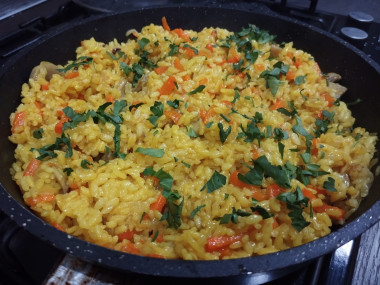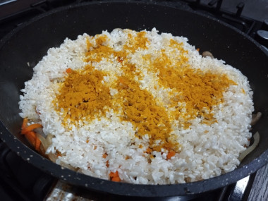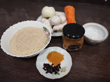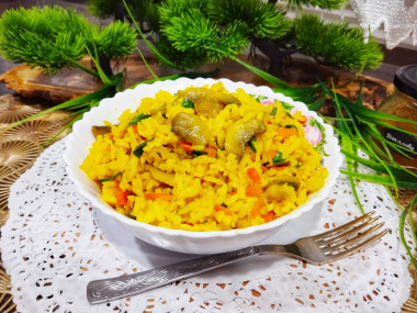 Рис промыла несколько раз и добавила в сковороду к овощам и грибам. Посыпала куркумой, добавила соль, барбарис и специи для плова. Налила воды,перемешала и протушила до готовности. Готовое посыпала измельченной зеленью петрушки.