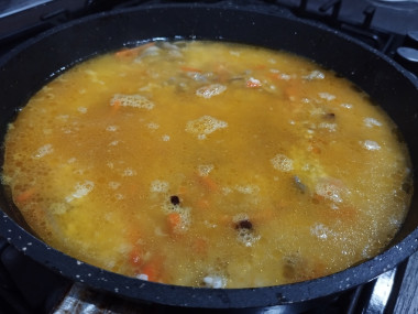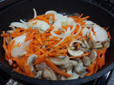 Грибы у меня были шампиньоны,которые я порезала пластинками и слегка обжарила. Добавила к ним лук, порезанный полукольцами и морковь, порезанную небольшими брусочками.