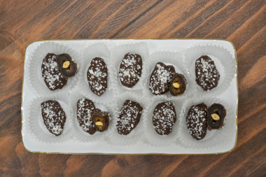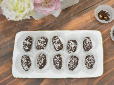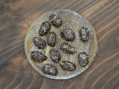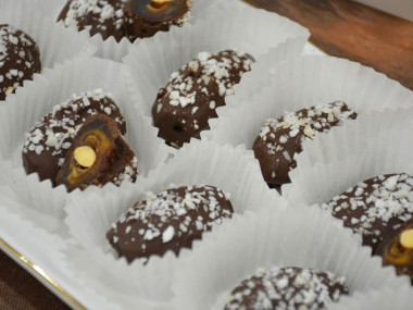Достаньте конфеты из морозильной камеры и уберите лишний шоколад, который застыл по бокам. Финики в молочном шоколаде с миндалем готовы. Приятного аппетита!