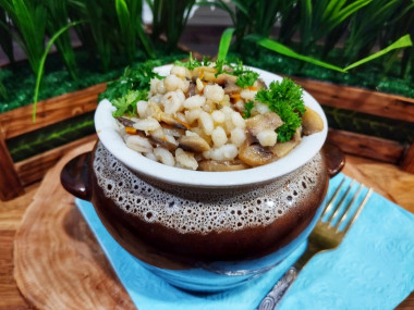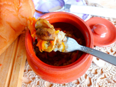 Положите сверху на кашу обжаренные грибы с овощами. Залейте бульоном, распределяя жидкость по всем горшочкам. Поставьте в предварительно разогретую до 200 градусов духовку примерно на 30 минут, закрыв крышечками.
