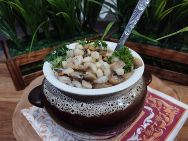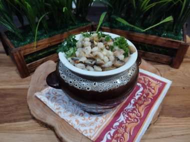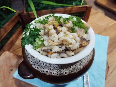 Как сделать перловую кашу с грибами в горшочках? Подготовьте продукты. Также подготовьте горшочки для запекания. Если у вас нет горшочков, то можно воспользоваться обычной формой для запекания. Отварите перловку в подсоленной воде до полуготовности в течение около 20 минут. Снаружи она должны стать мягкой, а внутри еще сохранить жесткость. Откиньте перловку на дуршлаг, чтобы стекла лишняя жидкость. О нюансах приготовления перловки читайте в конце рецепта.